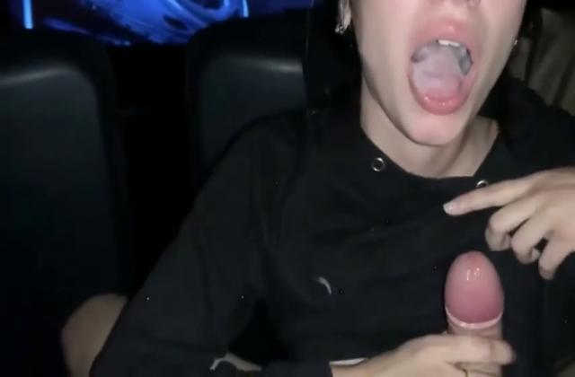 Брюнетка с маленькими сиськами сосёт в кинотеатре во время показа фильма